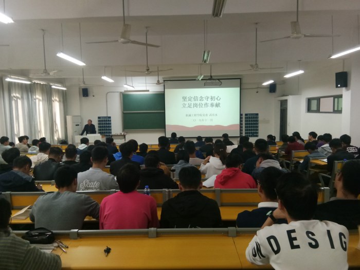 根据校党委“不忘初心、牢记使命”主题教育部署要求,11月1日下午,机械工程学院党委书记武有水在天工北214教室,为全体党员作了一场题为“坚定信念守初心 、立足岗位作奉献”的主题教育专题党课报告。