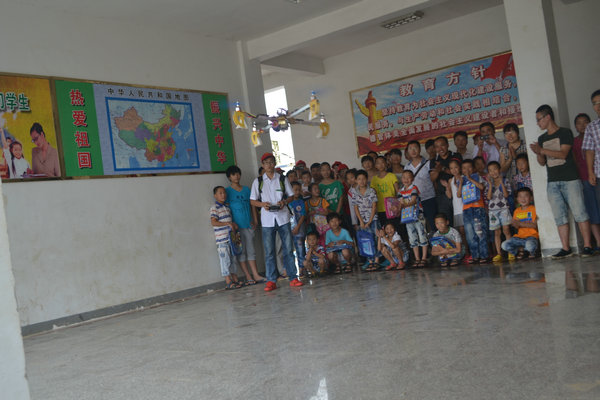 当四旋翼飞行器机器人从飞行场地划过,伴随喷着彩色的烟,这让小岗学校的孩子们大开眼界,现场立刻欢声雷动,拍手叫好。