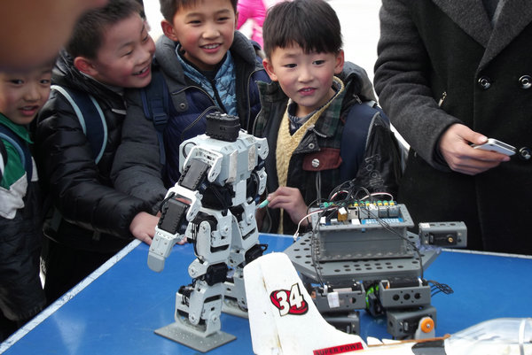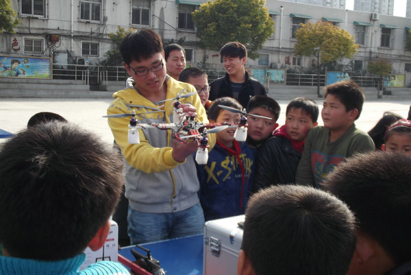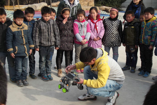 阳春三月,春风送暖,机械工程学院以学校“学雷锋志愿者服务月”为契机,扎实推进学习雷锋精神实践活动。为了更好学习雷锋精神,2014年3月17日下午,机械工程学院2012级志愿者志带着自由度小车、航空模型和机器人来到淮南市田家庵区第二十小学,为广大小学生带来一堂别开生面的科技宣传课。