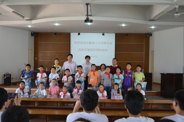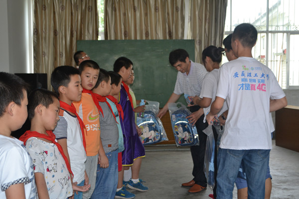 机械工程学院在活动前期对茂林小学进行了详细的调研,进行了沟通,得知小学有部分同学家庭经济极其困难,暑期不能与父母团聚,学院决定对这部分学生捐助爱心书包与文具,并设计了系列帮扶活动与文艺节目,以期为他们带去快乐与欢笑。座谈结束后,双方共同出席捐助仪式,张安宁、徐育军亲手为小学的20名留守儿童送去了爱心书包与文具,并鼓励他们珍惜光阴,勤奋学习,立志成才,为将来建设家乡、回报社会打好坚实基础。