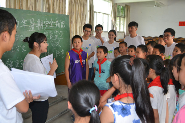 服务团志愿者与留守儿童学习安全知识、开展活动并合影(摄影:小学提供)