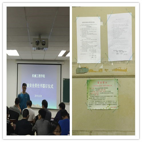 10月8日,发放“寝室温馨提示”,以文育人,以文化人,积极营造安全稳定的和谐氛围与寝室环境。10月18日起,辅导员分批次带领学生代表、抽烟学生和班级安全责任人(班长、生活委员)到君安高层公寓1号楼12406消防安全警示房开展现场安全教育,结合省内最近发生的火灾安全事故进行实例教育,实现安全教育日常化、生活化、具体化。辅导员与班级安全责任人(班长、生活委员)签订《机械工程学院学生消防、安全目标责任书》,发挥班级学生干部的模范带头作用。班级安全责任人与各寝室签订安全责任书,使每一个学生进一步明确学生宿舍的安全、卫生、禁烟、文明自律、人身安全等方面的安全规定,责任层层落实,充分调动大学生自我教育、自我管理、自我服务的积极性和实效性。