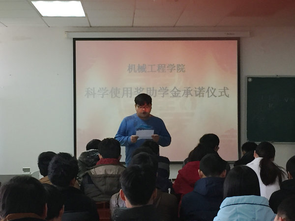 12月4日,机械工程学院在实验中心大楼1107教室举行科学合理使用奖助学金公开承诺仪式。学院党委副书记徐育军、2013级辅导员、学生代表共100余人参加了承诺仪式。