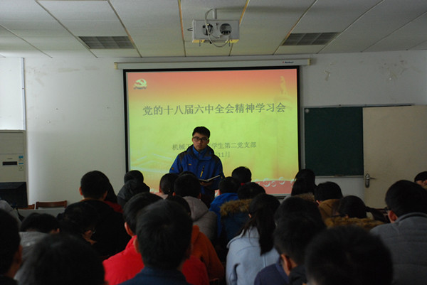 11月23日,机械工程学院学生第二党支部在学院1107教室学习党的十八届六中全会精神。