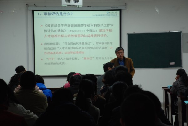院长王传礼围绕本科教学工作审核评估目的、内容、标准等方面,对审核评估范围中的“6+1”审核项目、24个审核要素、64个审核要点等内容进行了深入分析和解释,进而明确了学院、教师、学生的主要任务。