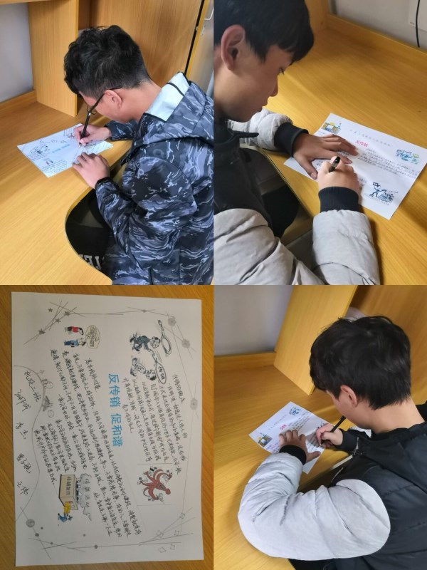 机械学院学生会组织全体同学在“防传销与非法集资”横幅上签名,表明坚决抵制传销和非法集资的决心;机设2018级1班、2班在天工北501、502教室召开主题班会,普及基本防骗知识,展示以宿舍为单位共同创作的手抄报,图文并茂,生动形象,告诫大家要注意加强自我防范,远离传销;机设2017级3班、4班在天工楼105教室组织观看防传销视频,了解传销的消极影响及危害;过控2018级5班在明理北309教室自导自演了一场生动的情景剧,主要角色有传销人和受害人,深刻展示了传销的手段和危害性,旨在提高防范意识。其他班级和年级也通过主题班会、观看视频、实践活动等形式开展宣传教育活动。