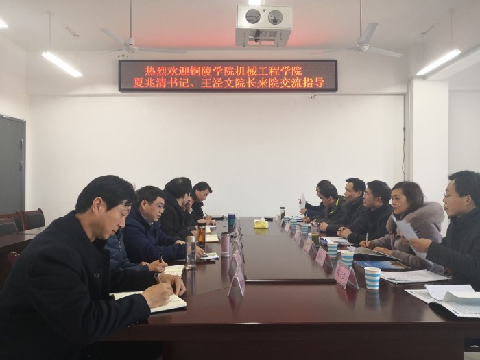 3月7日,铜陵学院机械工程学院夏兆清书记、王泾文院长一行8人来机械工程学院就专业评估及实验室建设事宜进行考察交流。双方在学院会议室A402举行了座谈交流会,学院领导及部分教师参加了座谈会。座谈会由学院张安宁书记主持。