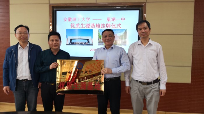 王开松一行还赴安徽省巢湖中学建立优质生源基地,受到了该校校长王晓光等热烈欢迎。双方签订了《安徽理工大学优质生源基地共建协议书》,并授优质生源基地牌。希望双方以优质生源基地共建为契机,加强沟通联系,积极合作并建立长效机制,为选拔、输送和培养优秀学生搭建更好的平台,吸引更多优质考生报考我校。