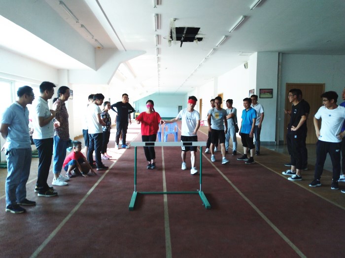 在至诚体育场室内训练大厅,师生首先开展了“障碍赛跑”、 “捆腿跑”活动。在“障碍赛跑”中,老师与同学一对一组合,蒙住双眼,跨越随机设置的障碍栏杆,师生相互鼓励,默契配合,在大家的加油声中,力争在最短时间到达终点;“捆腿跑”中,师生准备充分,密切配合,争分夺秒,共同完成规定任务,整个活动过程一片欢声笑语。随后,师生共同在室外开展了定点投篮比赛,并进行了限时三分球表演。