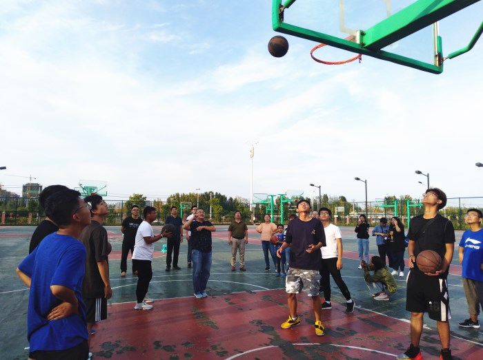 在至诚体育场篮球场地,师生首先开展了“捆腿障碍”赛跑、“背夹球”赛跑活动。在“捆腿障碍”赛跑中,老师与学生组合,捆住双腿,跨越随机设置的障碍栏杆,师生相互鼓励,默契配合,在大家的加油声中,力争在最短时间通过50米赛程;“背夹球”赛跑中,师生准备充分,密切配合,争分夺秒,共同完成规定任务,整个活动过程一片欢声笑语。随后,师生共同开展了定点投篮比赛,并进行了限时三分球表演。