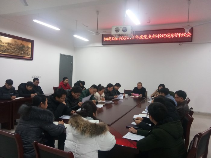 1月10日下午,机械工程学院党委在励学楼A402会议室召开2019年度基层党支部书记述职评议会。学院党政领导班子成员、党委委员、师生和群众代表30余人参加了会议。会议由学院党委书记武有水主持。