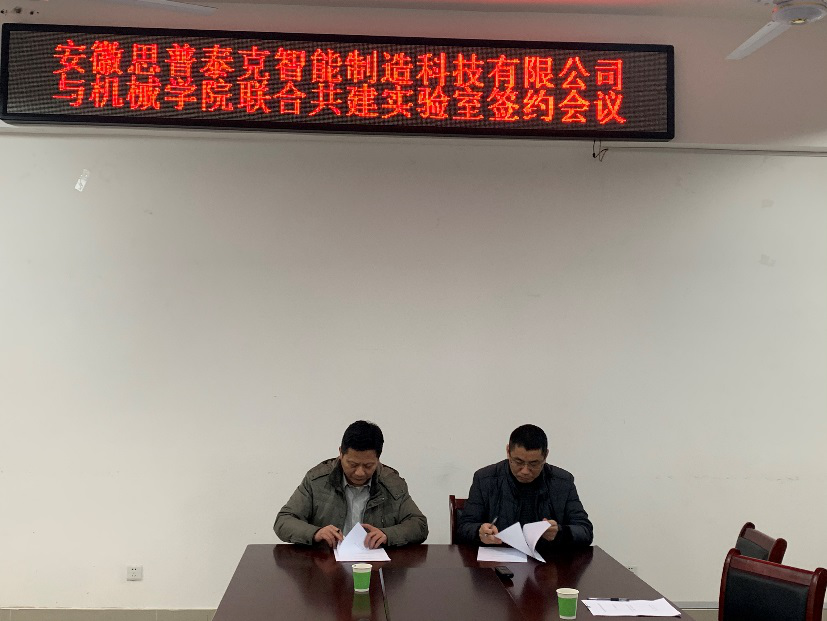 1月17日下午,机械工程学院与安徽思普泰克智能制造科技有限公司联合共建智能视觉检测实验室签约仪式在励学楼A402会议室举行。学院副院长(主持工作)王开松与公司总经理朱卫华签订了共建智能视觉检测实验室协议。机械学院汪选要教授、姜阔胜副教授和公司副总经理高晨辉参加了会议。