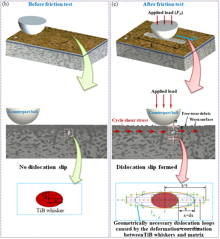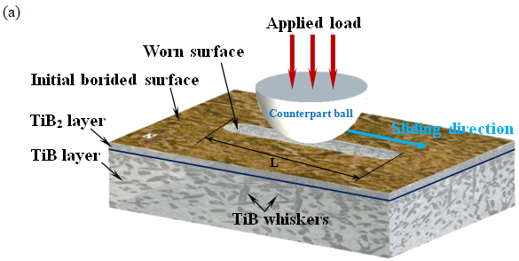 为提高航空齿轮用钛合金表面抗磨损性能,朱延松副教授团队采用稀土-硼固体共渗方法对新型TC21-DT钛合金表面进行强化处理,在钛合金表面制备了双硬质相(TiB2+TiB)硼化钛渗层。在此基础上,建立了基于Eshelby等效夹杂理论的渗层表面单轴压缩模型及基于Archard磨损方程的渗层表面磨损模型。研究结果表明稀土-硼固体共渗强化可显著提高钛合金表面硬度和抗磨损性能。且适量稀土元素的加入有利于Ti-B相形核率的增大,导致TiB须晶颗粒细晶强化效应明显,从而使钛合金表面抗磨损性能得到进一步提高。