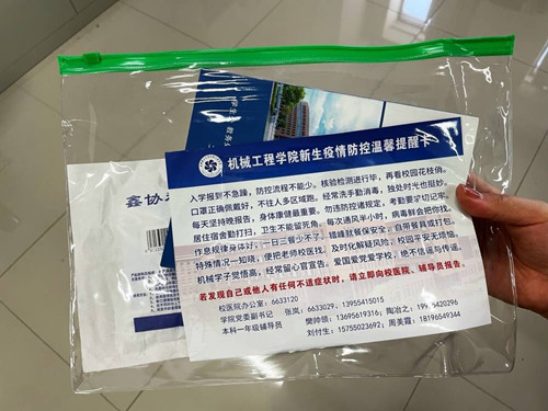 厚厚的一包,颠在手里沉甸甸。打开封口,一张温馨提醒卡醒目出现。这张提醒卡不仅印有学院学生工作干部的联系方式,更是将疫情防控要求、早晚报告制度、学习作息指导等多方面的信息编成一首打油诗。“入学报到不急躁,防控流程不能少;核验检测进行毕,再看校园花枝俏……”。此外还有一包口罩和一个体温计,这既是后疫情时期学生的标配,更是防控意识在前的标识。最后压轴的是囊括所有学生四年中最重要事务的宝藏书籍——最新版《学生手册》。