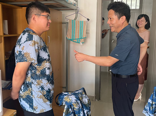 “读得是什么书?”“《中国共产党简史》,我从我爷爷那边拿过来的!”王开松探过身拿起书,仔细翻了翻。微微泛黄的纸张,钢笔划过的痕迹,这是一代人向一代人的传承。“多读书好啊,我上学那会也研读《共产党宣言》《资本论》。但那会年纪小读不懂,我就一遍遍看。”从阅读到家乡,再到生活适应情况,学院领导耐心地与新生交流,并在交谈间隙指引他们未来方向。