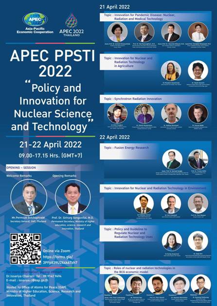 4月21-22日,以“开放、连通、平衡”为主题的亚太经合组织(APEC)科技创新政策伙伴关系机制(PPSTI)APEC中心核科学与技术政策与创新会议(Policy and Innovation for Nuclear Science and Technology)在泰国成功召开。机械工程学院师生通过线上和线下相结合的方式参加了会议。