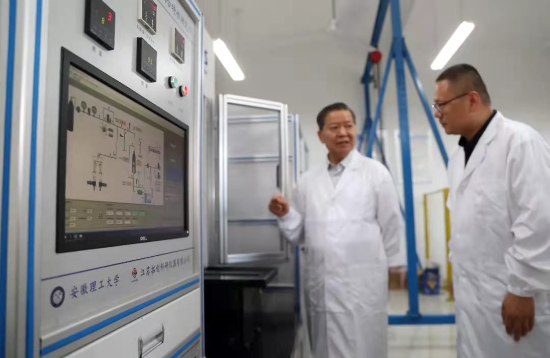 袁亮院士在深部煤矿采动响应与灾害防控国家重点实验室与青年教师一起使用煤与瓦斯突出物理模拟装置开展科研攻关。