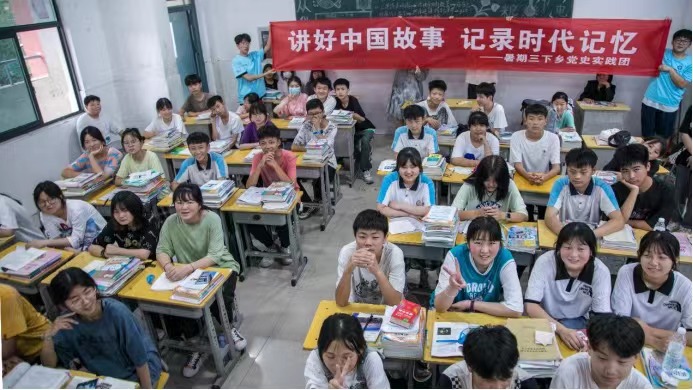 除了亲身感受革命记忆,党史学习教育实践团更是奔赴蒙城县辛集中学为当地学生准备了一场生动的党史学习教育课。队员们打造了两个不同的“体验场域”,分别是“觉醒与建设的年代”和“新时代美好续篇”,阐述了中国共产党从革命时期、建设时期到改革开放时期、新时代的伟大精神谱系。讲好中国故事,从南湖小船开天辟地的觉醒到长征中的两万五千里征程,再到洪水中“人墙”的众志成城,和疫情之下英勇逆行的身影,志愿者们讲得投入且深情,孩子们听得认真且感动。