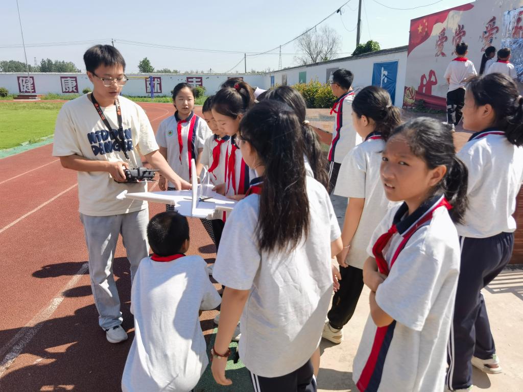 在淮南市谢家集区孤堆回族乡小学,实践团成员为孩子们开展机器人操作和航模的展示活动。实践团成员详细介绍了智能机器人的工作原理和适应场景,并进行实际的操作与展示,鼓励孩子们敢于探索追求创新,孩子们跃跃欲试,纷纷要求进行机器人和航模操作体验。