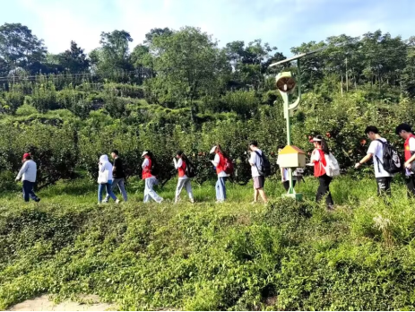 青春梨园行,上山调研路。烈日炎炎,调研小分队走进池州市东至县高岭村三条岭特色果园。在梨园负责人胡学斌的带领下,实践团成员沿着山间小路,边走边听梨园发展情况介绍。胡学斌的执着坚定,果农们的辛苦付出,小蜜蜂的勤劳酿蜜,都给这群00后的大学生们上了一堂生动的社会实践课。通过调研发现,发展特色产业,必须立足资源优势,擦亮特色“品牌”。调研队成员认为,梨园的发展还需创新模式,推广“企业+合作社+农户”的组织方式,带动农户,充分享受乡村振兴的红利。