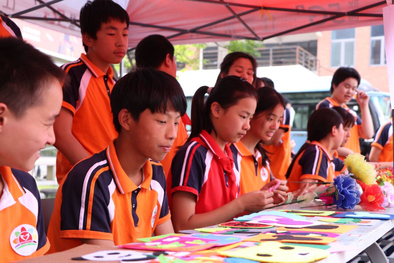 在仁苑食堂门口,孩子们为大家摆台展示了亲手制作的手工艺品。粽子小香包、花朵小戒指、红色剪纸画、小樱桃盆栽等,当一件件小工艺品展现在大家面前时,陪同的领导老师还有志愿者都忍不住赞叹于这些工艺品的精美。孩子们看到大家如此喜欢自己制作的东西,也特别高兴,兴奋地向参观者介绍使用材质、设计构思、制作技巧等。