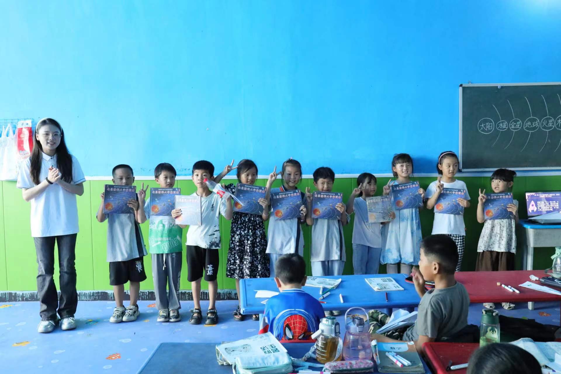 活动第一站,志愿者们来到了众多留守儿童所在地——朱马店镇肖集村,借助自己的专业知识与特长,开展了丰富多样的教学活动。在天文课上,志愿者带领孩子们走进了浩瀚的宇宙星空,激发了他们对科学知识的向往与探索欲望。在心理课中,志愿者们运用专业的心理知识和有趣的互动游戏,帮助留守儿童们更好地认识自我、增强自信,在爱自己的同时尊重关爱他人,向他们传播讲述“星星的孩子”,他们纷纷为这群“折翼的天使”送上美好的祝愿。
