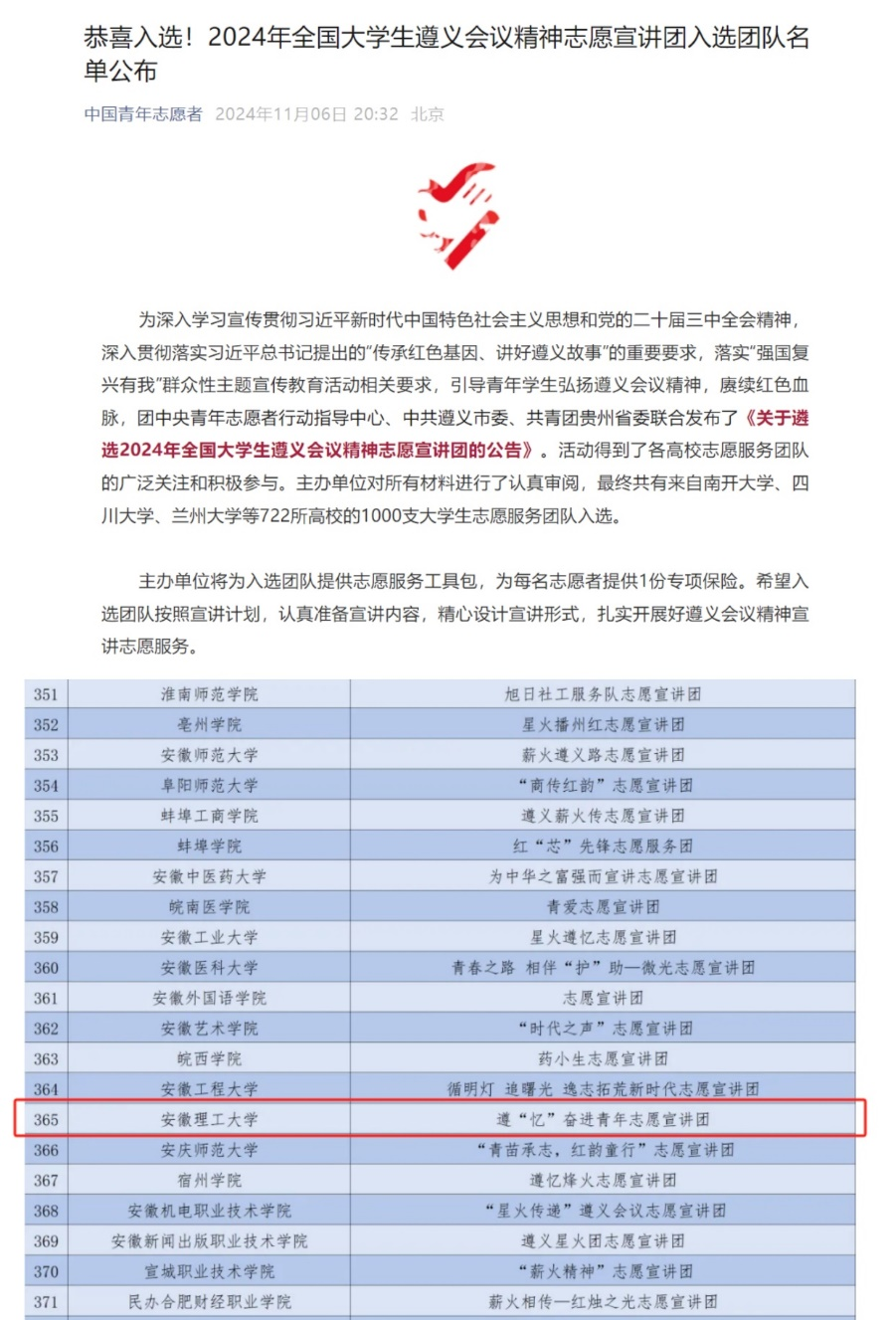 近日,由团中央青年志愿者行动指导中心、中共遵义市委、共青团贵州省委联合开展的“遴选2024年全国大学生遵义会议精神志愿宣讲”活动结果公布,安徽理工大学机电工程学院申报的“遵‘忆’奋进青年志愿宣讲团”成功入选,也是学校唯一入选的宣讲团队(全国共1000支)。