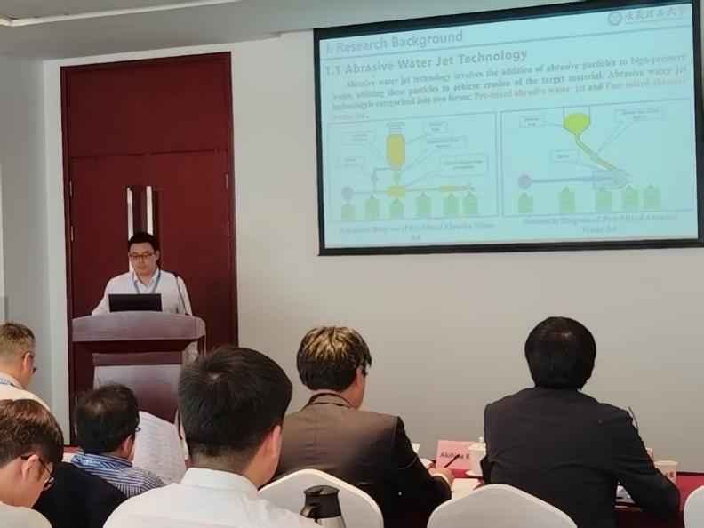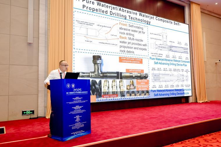 中国工程院院士李根生教授担任本次会议主席。本次大会共举行了9场特邀报告和31场学术报告,机电工程学院王岩副教授以《安徽理工大学水射流研究进展》为题作大会主旨报告,向与会人员介绍了我校超高压前混合磨料技术与装备研发、磨料水射流在核聚变装置材料加工、煤矿辅助破岩等方面的研究进展;青年教师谢淮北以《超高压前混合磨料水射流装置混砂机理研究》为题作学术报告,深入探讨了磨料粒子在高压水射流中的加速规律与混合机制,为超高压前混合磨料水射流混砂均匀性提供理论基础。