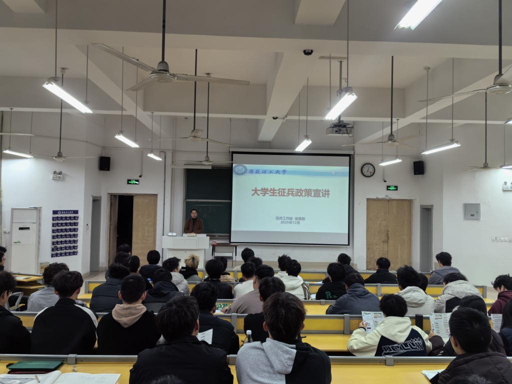 2026年上半年全国征兵(男兵)应征报名通道即将开启,为积极响应国家征兵号召,激发青年学子参军报国热情,12月1日晚,机电工程学院在天工203教室举办大学生征兵政策宣讲会,校党委武装部徐意刚老师受邀主讲,为同学们送上全面详实的征兵“政策指南”。学院各年级本科生代表近200人参会。