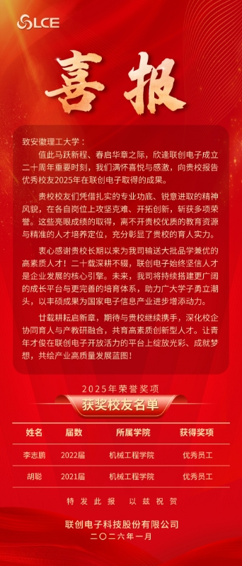 联创电子科技股份有限公司在喜报中对我院毕业生扎实的专业功底、锐意进取的精神风貌给予了高度评价,充分肯定了他们在岗位上出色表现和为公司发展作出的积极贡献。公司表示,李志鹏与胡聪两位员工在工作中展现出的敬业精神、实践能力和创新意识,充分体现了安徽理工大学优质的教育资源与精准的人才培养定位,充分彰显了学校的育人实力。