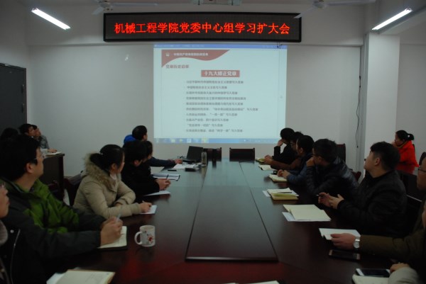 12月27日,机械工程学院在学院A402召开党委中心组学习扩大会,专题学习党的十九大通过的《中国共产党章程(修正案)》,党委委员、支部书记、师生党员代表参加会议。会议由院党委书记张安宁主持。