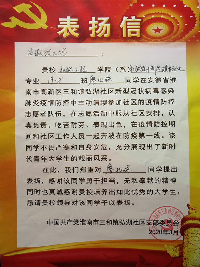 3月18日下午,在战“疫”曙光初现,全省解除封闭式管理前夕,机械工程学院收到了来自淮南市高新区三和镇弘湖社区党支部的一封表扬信,表扬2019级机械设计制造及其自动化专业廖孔琛同学在社区新冠肺炎疫情防控中的优异表现。