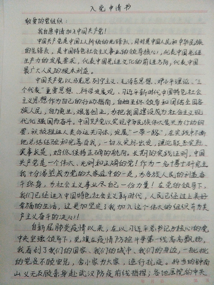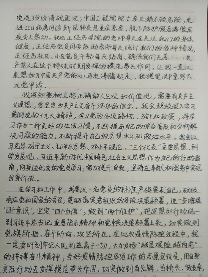 “自新冠肺炎疫情以来,在以习近平同志为核心的党中央坚强领导下,党旗在疫情防控斗争第一线高高飘扬。我看到了我们的国家、我们的城市、我们的身边,一批批的党员不顾安危,舍小家为大家,逆行抗疫。84岁的钟南山义无反顾亲身赴武汉防疫前线指挥;各地医院的中共党员纷纷请战武汉;中国工程院院士李兰娟不顾危险,走进ICU病房问诊新冠肺炎危重症患者,脱下防护服后满脸压痕令人感动。我也正经历学院的老师每天在关注我们的身体健康,正经历党员同学协助老师每天统计我们的各种情况,正经历社区、小区党员干部每天站岗、确保我们无恙……共产党人在这个特殊时期发挥的模范带头作用,让我一直以来想加入中国共产党的心再次沸腾起来,我提笔郑重写下入党申请。”这是入党申请书中的词句。