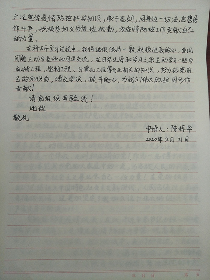 陈梓华2017年考入我校,攻读控制工程专业硕士研究生,期间获得了大批学科竞赛奖励,并多次取得了学业奖学金,毕业论文获评“优秀毕业生大论文”,曾被评为“优秀毕业研究生”。 2019年,进入机械工程学院机械工程专业攻读博士学位。研究生学习期间,陈梓华认真学习领会习近平新时代中国特色社会主义思想和党的最新理论成果,积极向身边先进党员看齐,思想觉悟日渐成熟,入党动机日趋端正,入党愿望日益强烈,2月21日晚,在参加完当天的志愿服务工作后,陈梓华郑重写下了入党申请书。他表示,在此次疫情防控过程中,一定时刻牢记人民利益高于一切,大力发扬“越是艰险越向前”的拼搏奋斗精神,当好疫情防控各项工作的志愿宣传员,宣传科学知识,敢于亮剑,用自身实际行动去发挥模范带头作用,切实做到当先锋、当排头、做表率, 争取早日成为一名光荣的中共党员。