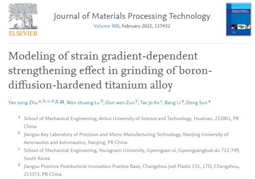 近日,我校机械工程学院朱延松副教授团队与南京航空航天大学卢文壮教授、左敦稳教授,韩国岭南大学Tae Jo Ko教授等共同合作,对航空齿轮用新型钛合金TC21-DT稀土-硼共渗表面磨削加工过程中应变梯度强化效应进行了系统研究。该成果以” Modeling of strain gradient-dependent strengthening effect in grinding of boron-diffusion-hardened titanium alloy” 为题发表在制造学科国际TOP期刊Journal of Materials Processing Technology (JMPT,IF=5.551,排名:6 / 153)。