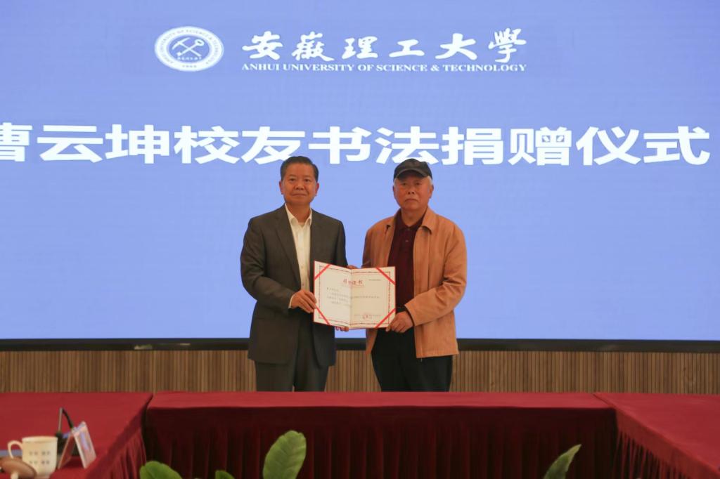 袁亮从学校的办学规模、办学质量、招生就业、科研合作和人才培养等方面向校友介绍学校近年来的发展情况。他指出,曹云坤校友将多年来的创作精品无偿捐赠给学校,饱含着对学校的关心热爱和深情厚谊,体现了他大爱无疆的奉献精神和高贵品格。他强调,学校的高质量发展离不开广大校友的关心和帮助,希望广大校友都能够热爱母校、关心母校,为母校的各项事业发展贡献力量。袁亮代表学校接受了捐赠,并为曹云坤颁发了捐赠证书和校徽纪念章。